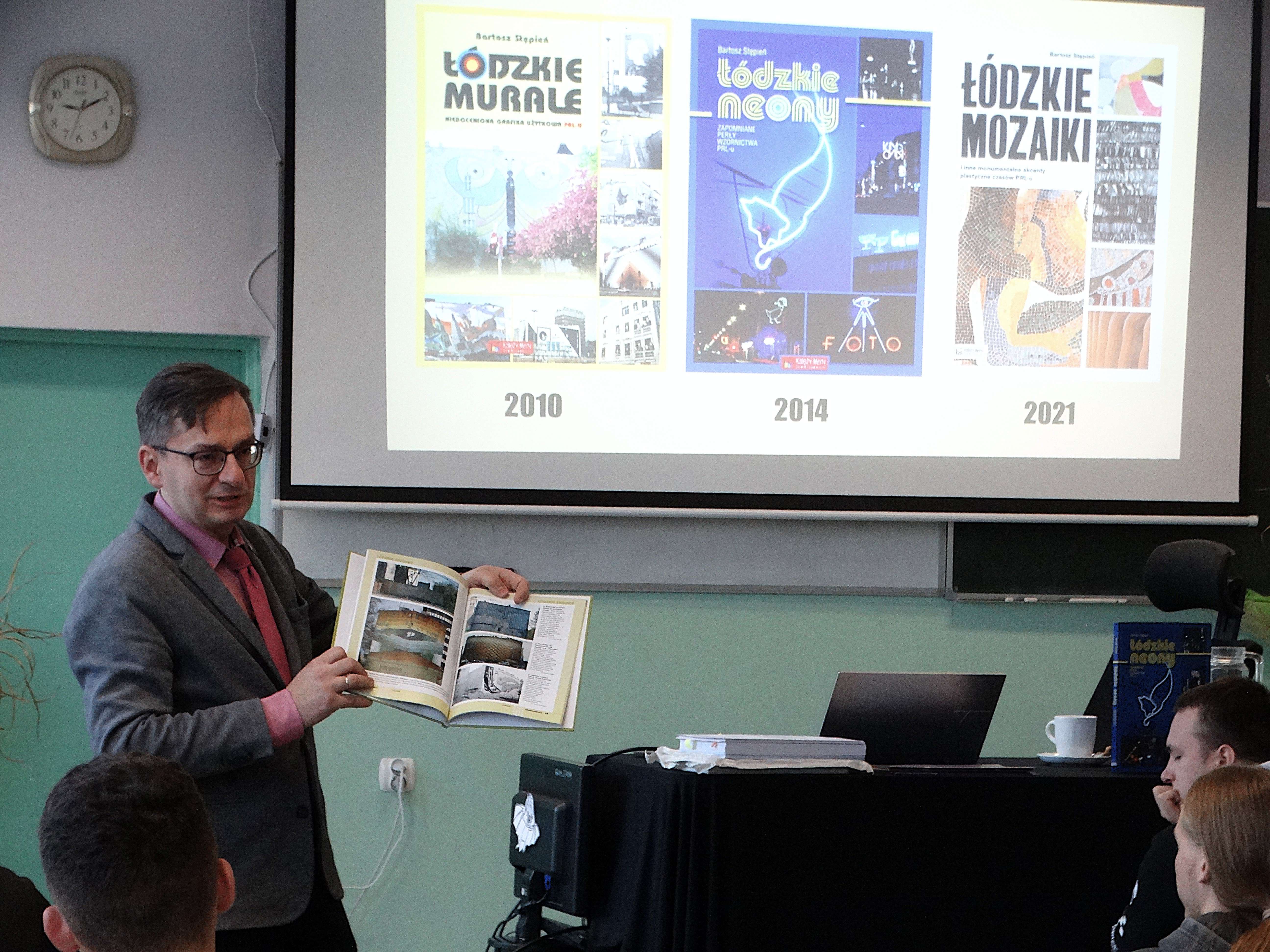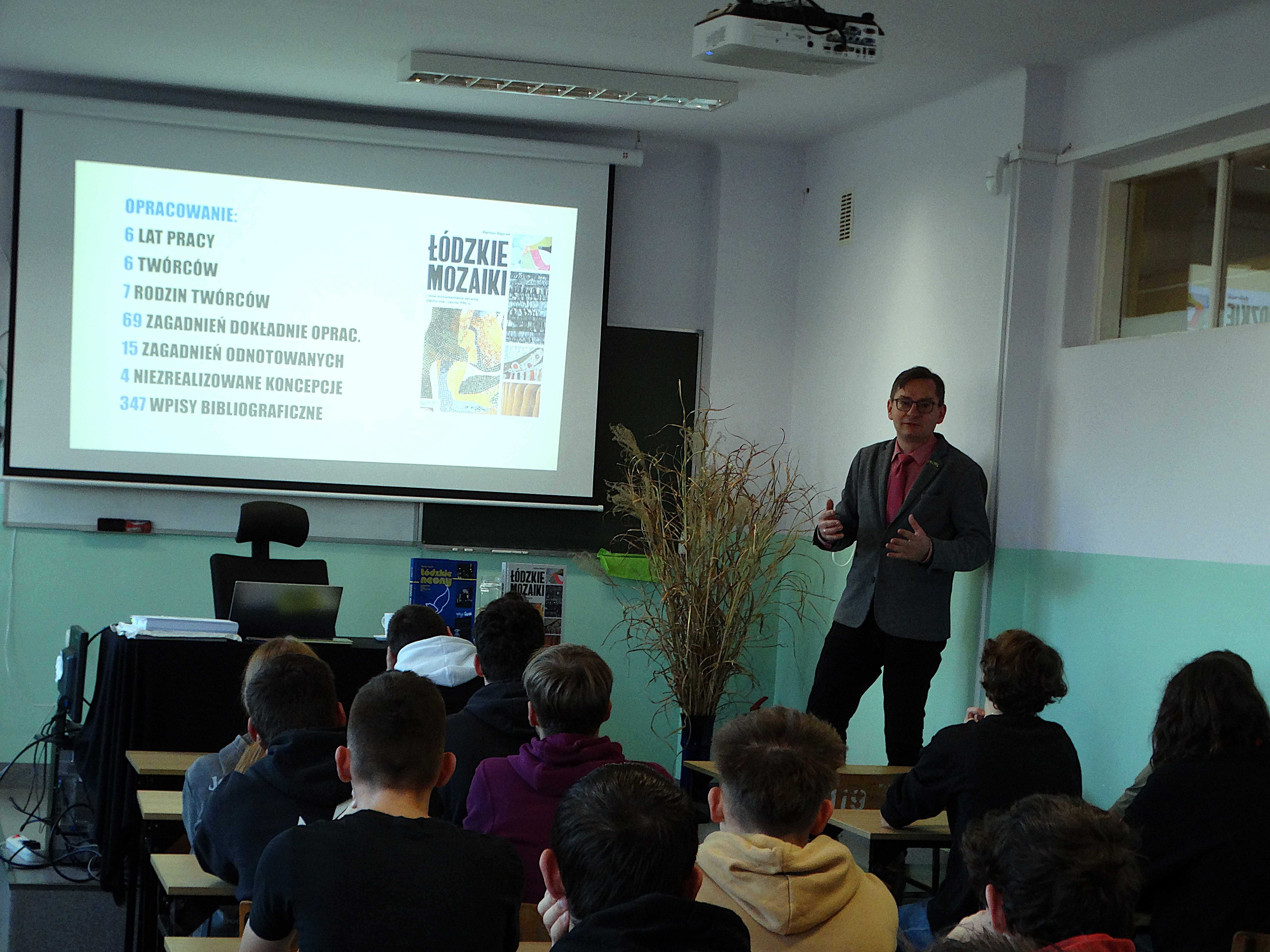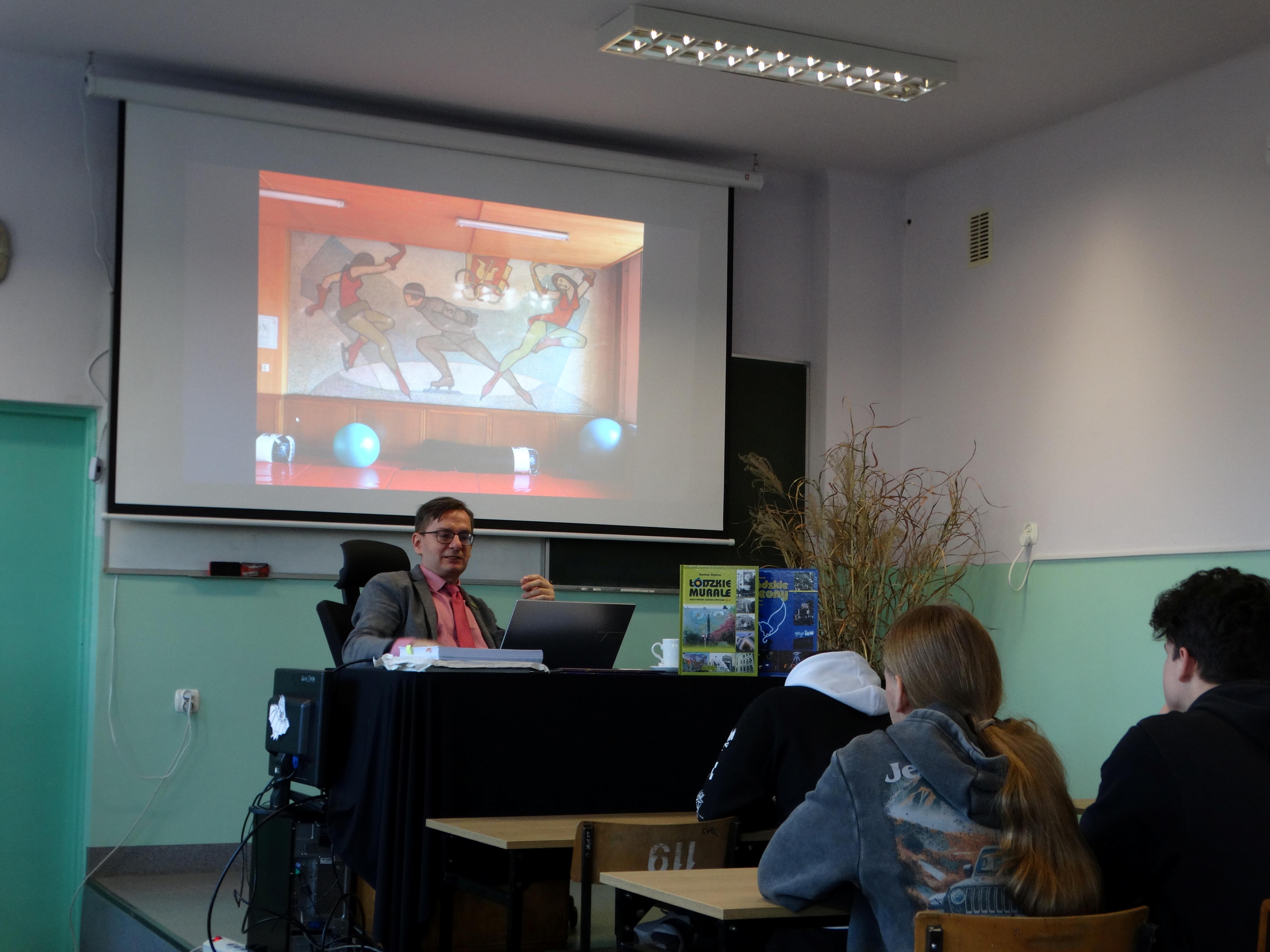 W listopadową środę jedna ze szkolnych sal lekcyjnych zamieniła się w małe centrum sztuki miejskiej. Naszym gościem był pan Bartosz Stępień, autor książek poświęconych łódzkim mozaikom, muralom i dawnym neonowym reklamom.