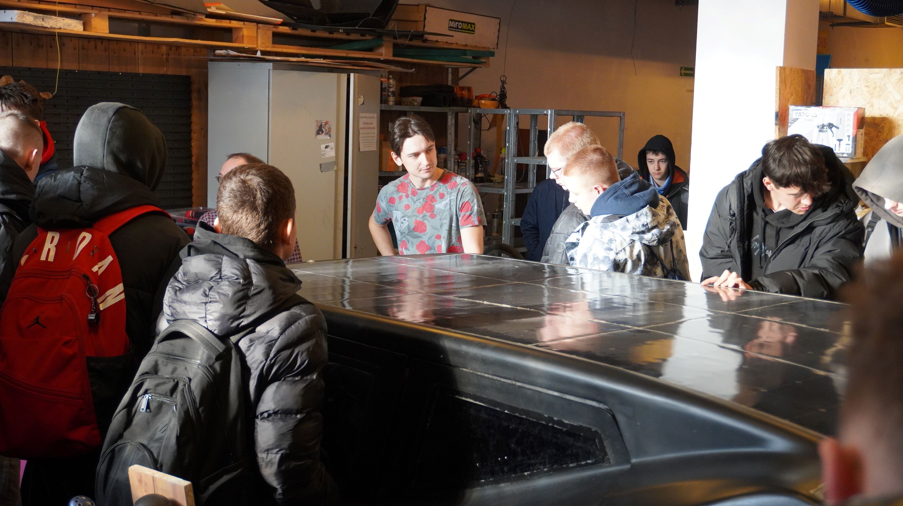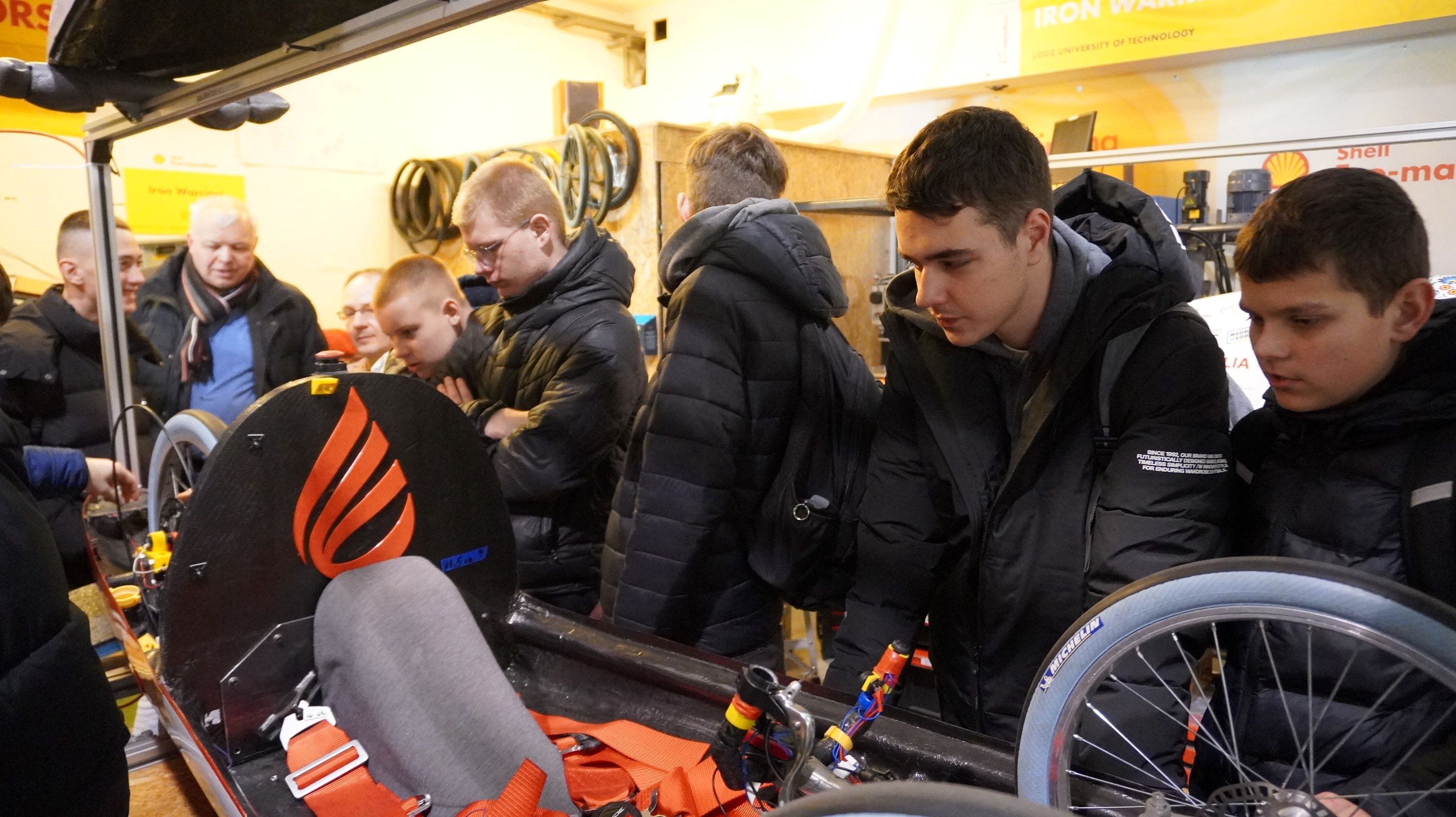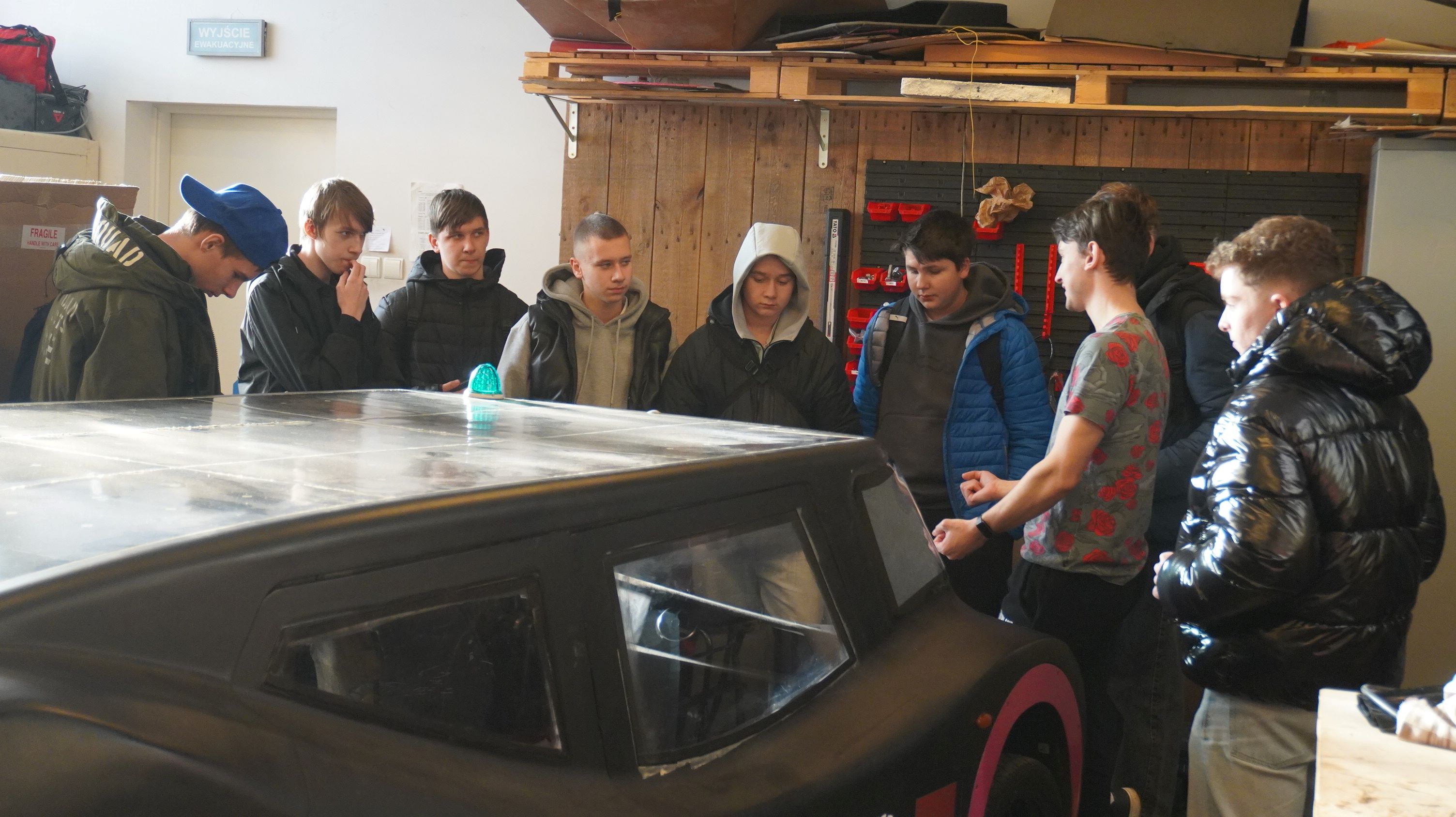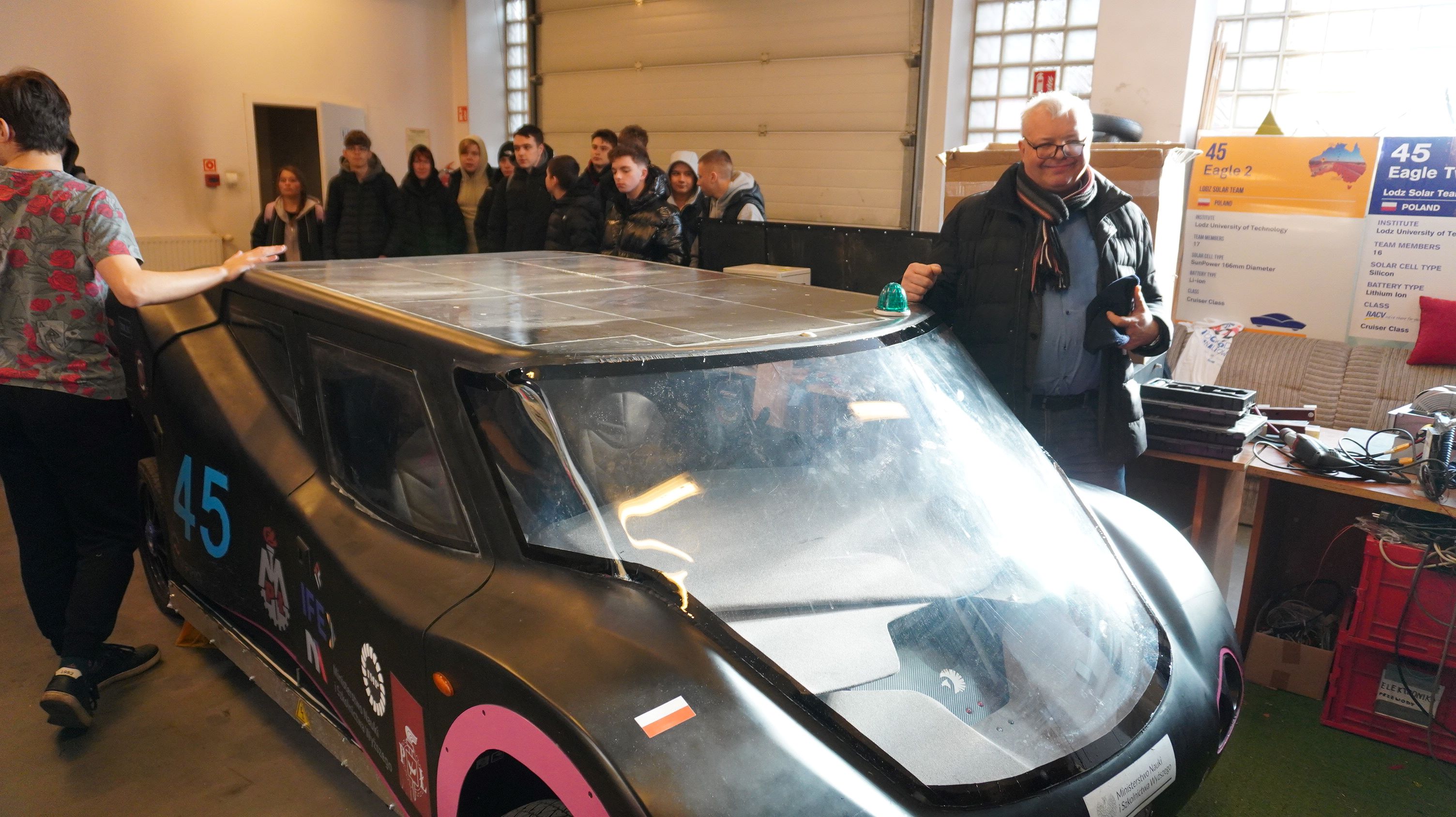W dniu 17 grudnia 2025 r. uczniowie uczestniczyli w zajęciach na Politechnice Łódzkiej. W ramach prowadzonych zajęć uczniowie mogli zapoznać się z osiągnięciami studenckiego Koła Naukowego, którego najbardziej widowiskowym i znanym w całym świecie efektem pracy jest pojazd zasilany energią słoneczną. Zestaw paneli fotowoltaicznych połączonych z akumulatorami pozwala osiągać pełnowymiarowemu samochodowi z pięcioosobową załogą blisko 700 km. zasięg, a w testach prędkościowych osiągnąć V max. ponad 110 km/h. Głównych informacji udzielał nam działający w kole naukowym Maksymilian Becht – student Wydziału Mechanicznego PŁ i absolwent naszego Technikum. Uczniowie mogli zwiedzić kampus Politechniki wraz z Zatoką Sportu co skłoni ich być może w przyszłości do podjęcia studiów na tej wymagającej Uczelni kształcącej niezwykle potrzebnych fachowców. Była to również podróż śladami naszego patrona prof. Jerzego Wernera, w przeszłości Dziekana Wydziału Mechanicznego i Rektora PŁ.